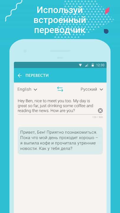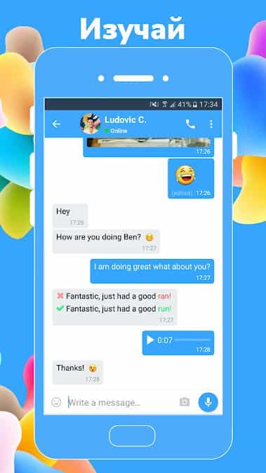 Пока вы не найдете собеседника, потренируйтесь общаться с ботом Amy. Он задает простые вопросы и помогает освоиться в приложении. В чате есть интересная функция: вы можете записывать голосовое сообщение на русском языке, а система автоматически переведет его на английский. Для практики письменной речи есть раздел «Проверка грамматики»: можно загрузить свой текст в специальное окошко и получить советы. Во вкладке «Помочь другим» вы можете редактировать тексты пользователей на вашем родном языке.