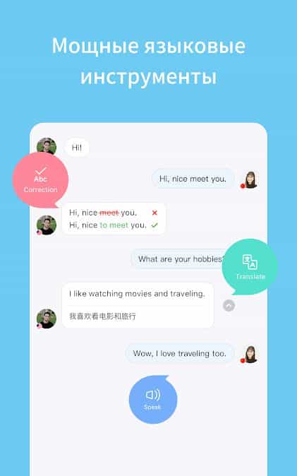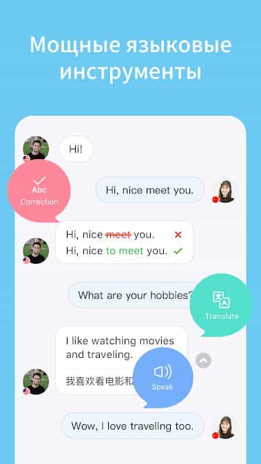 После прохождения модерации вы сможете найти собеседника, который подходит вам по возрасту, интересам и изучаемым языкам. Общение происходит в чате: вы можете отправлять текстовые и голосовые сообщения, созваниваться, обмениваться фотографиями и видео. В чате работает функция автоисправления и есть встроенный переводчик.