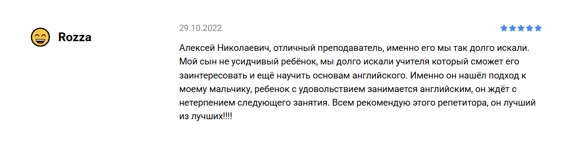 В отзывах обращайте внимание на результаты – что изменилось, после того как ребенок стал заниматься с этим репетитором. Повысилась успеваемость, стал лучше понимать, проявился интерес к языку, уверенность в говорении, сдал экзамен и так далее.