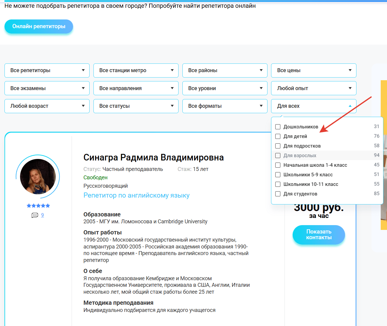 Для поиска репетитора зайдите на одноименную вкладку, выберите нужный вам формат и тип обучения (общий английский или подготовку к экзамену). Также можно отфильтровать выбор по цене, формату и опыту.