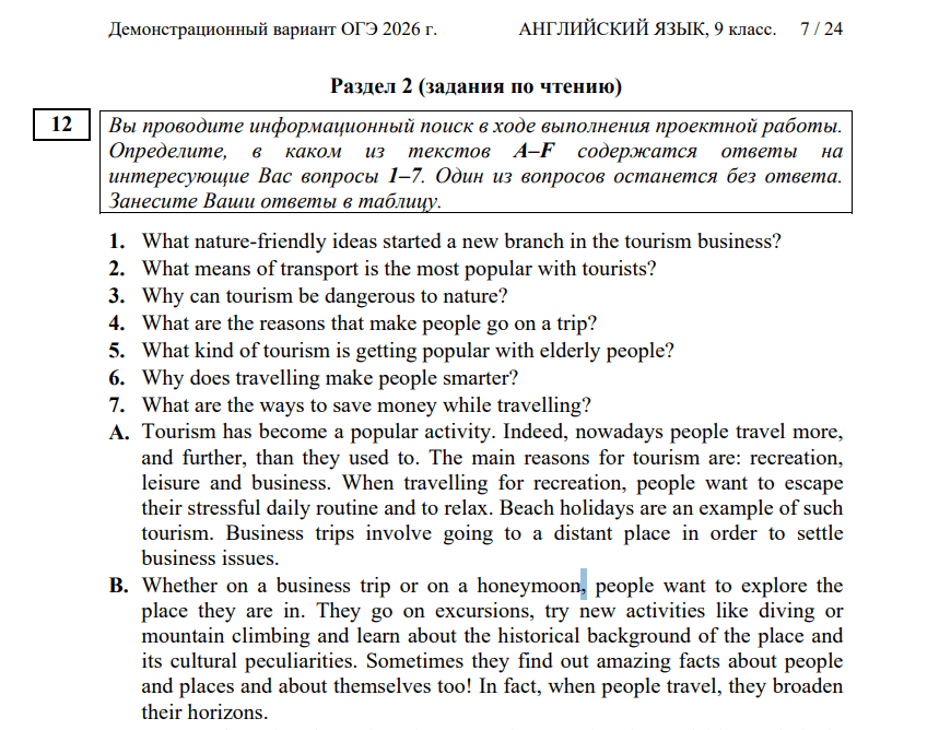 В первом задании нужно прочитать текст и сопоставить вопросы с параграфами, которые на них отвечают. На один из семи вопросов нет ответа.