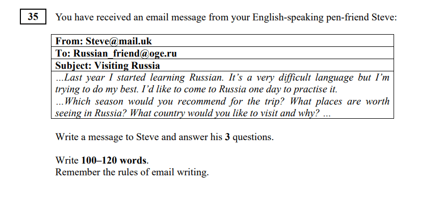 В этом задании ОГЭ по английскому языку нужно ответить на письмо англоязычного друга по переписке. Ответ должен быть объемом 100-120 слов. Важно его соблюсти, поскольку слишком короткое или наоборот слишком длинное письмо не засчитают.