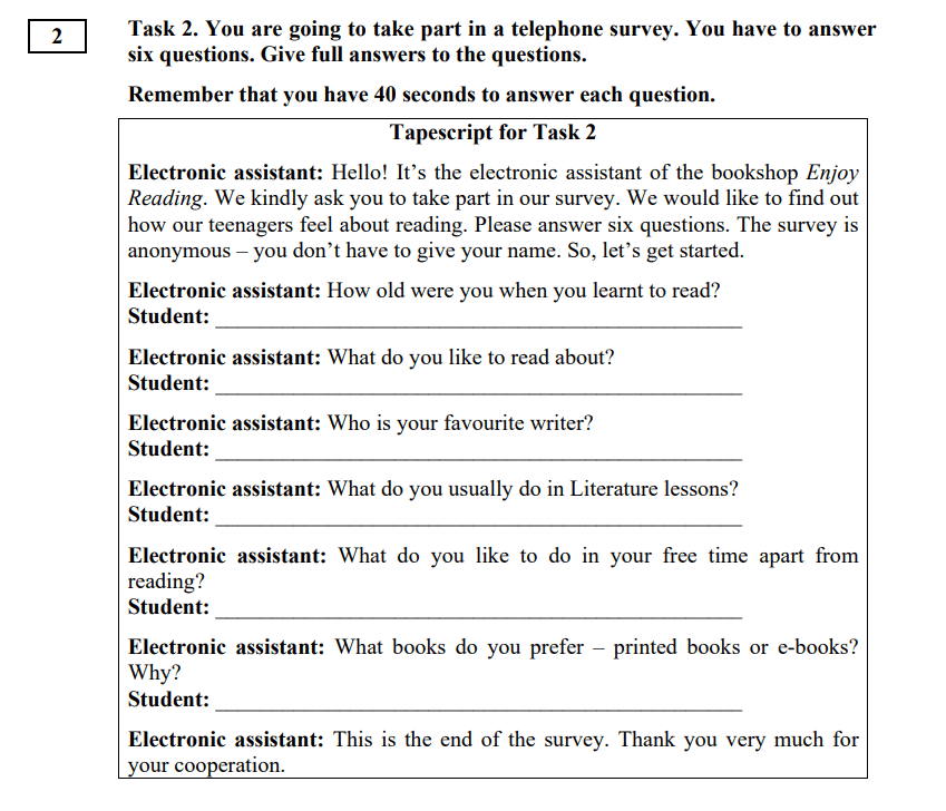 Задание 2. Поучаствовать в диалоге, отвечая на услышанные вопросы. Всего шесть вопросов и они воспроизводятся в аудиозаписи. Нужно успеть ответить на каждый в течение 40 секунд.
