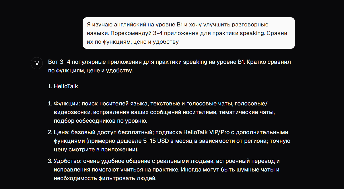 Пример промпта: "Я изучаю английский на уровне B1 и хочу улучшить разговорные навыки. Порекомендуй 3-4 приложения для практики speaking. Сравни их по функциям, цене и удобству. Также посоветуй YouTube-каналы или подкасты на темы "путешествия" и "повседневная жизнь" с четкой речью и субтитрами".