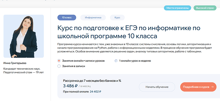 Образовательная программа выстроена по принципу последовательного углубления знаний. Ученики проходят все разделы экзаменационной программы, уделяя особое внимание алгоритмам обработки данных и программированию. Подготовка к экзамену включает регулярное тестирование, что помогает отслеживать динамику роста баллов. Особенность курса — системная работа с ошибками. После выполнения заданий ученики получают подробный анализ, что позволяет корректировать стратегию обучения. Такой курс подготовки подходит тем, кто ценит структурированность и долгосрочную стратегию.