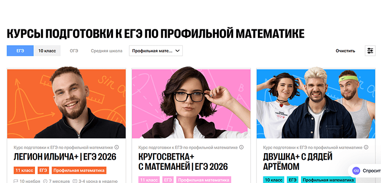 - Структура: четкое разделение на потоки для базового и профильного уровня математики, что позволяет сфокусироваться на нужных для экзамена задачах.