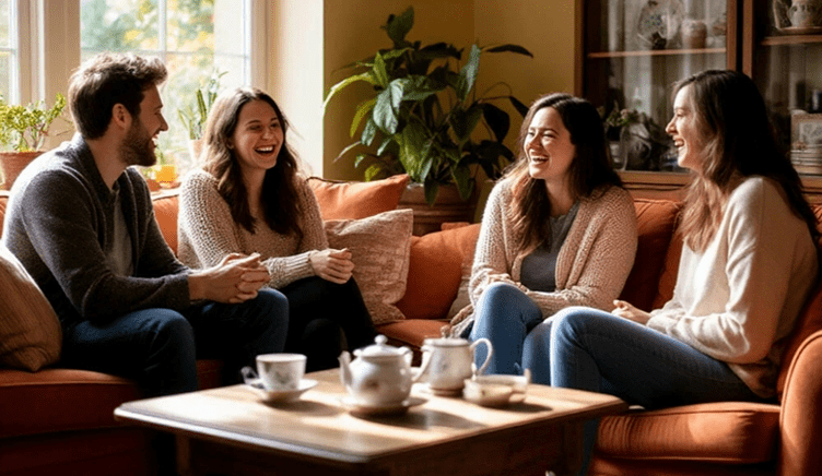 Уютная расслабленная атмосфера, чай с печеньками, общение, юмор и много живого английского. Всего 4-5 человек в группе и опытный преподаватель.