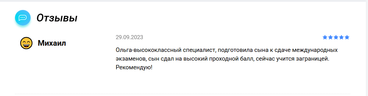Еще один индикатор – отзывы предыдущих учеников и родителей. Например, у нас под анкетами репетиторов можно найти отзывы, в которых они выражают благодарность или мнение о преподавателях.